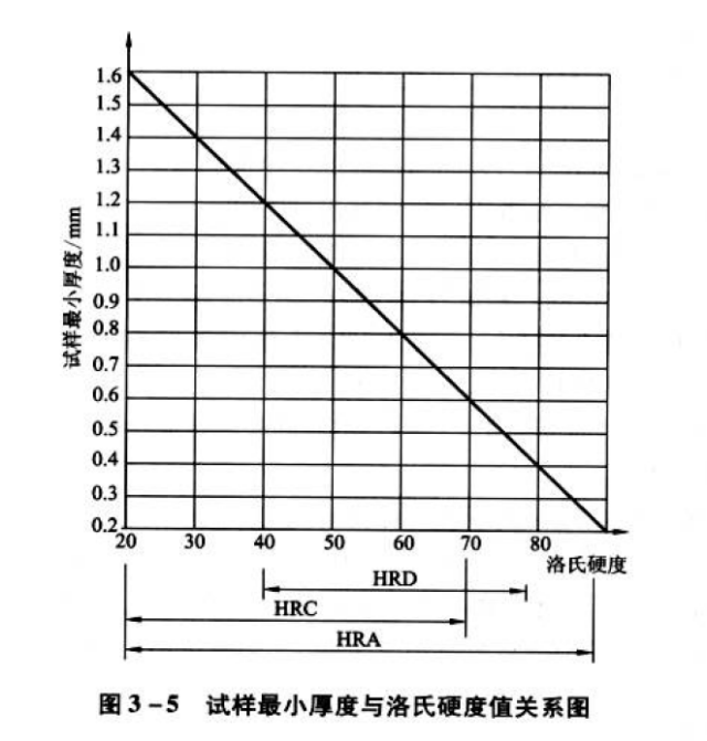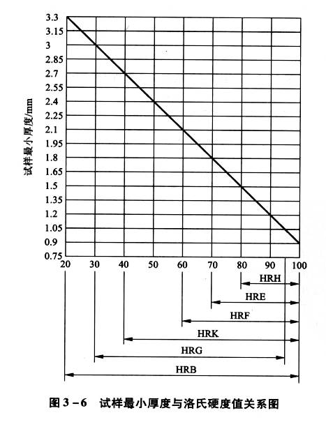 (2)對于在用金剛石圓錐壓頭進行的試驗,試樣或試驗層厚度應不小于殘余壓痕深度的10倍;對于用球壓頭進行的試驗,試樣或試驗層的厚度應不小于殘余壓痕深度的15倍。圖3―5和圖3―6給出了洛氏硬度最小厚度關系圖。