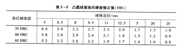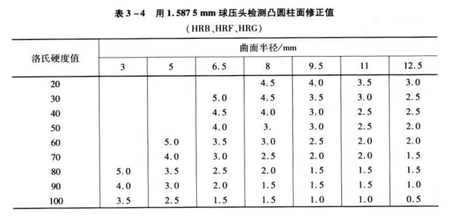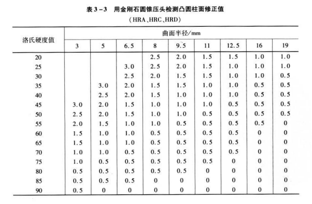 (2)對于在圓柱面和球面上測得的洛氏硬度值,應按表3-3~表3-5進行修正。表中修正值均為正值。